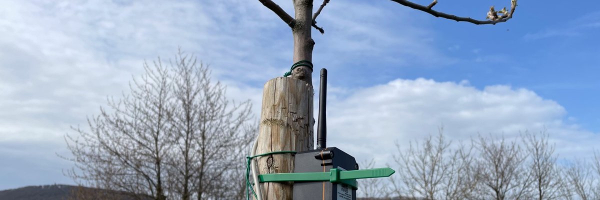 Im September 2022 haben wir auf der Streuobstwiese der Kreisverwaltung nahe der Burg Lichtenberg eine Wetterstation sowie fünf Bodenfeuchtesensoren zum Testen installiert. Ziel des Pilotprojekts ist es, durch die Messungen der Bodenfeuchte sicherzustellen, dass die Obstbäume auch im Sommer mit ausreichend Wasser versorgt sind und zu großen, fruchttragenden Schattenspendern heranwachsen. Zudem haben wir drei Bäume mit Sensoren, die die Feuchtigkeit in der Baumkrone messen, ausgestattet. Dadurch erhalten wir noch mehr und noch genauere Daten, um die Gesundheit der Bäume zu überwachen. Auch in der Ortsgemeinde Etschberg haben wir an den Wurzeln von Bäumen ebenfalls Bodenfeuchtesensoren angebracht.